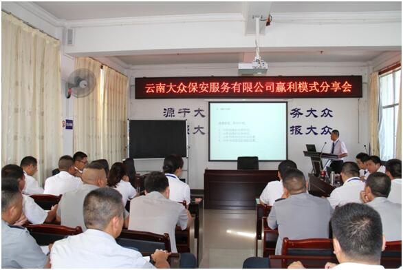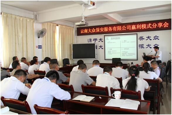 2015年7月4日上午9:00時(shí),大眾保安公司在公司四樓會議室開展了“贏利模式”培訓(xùn)分享會,會議由公司本部、安防分公司全體行政管理員工和思茅區(qū)保安服務(wù)中心大隊(duì)長共66人參加。
